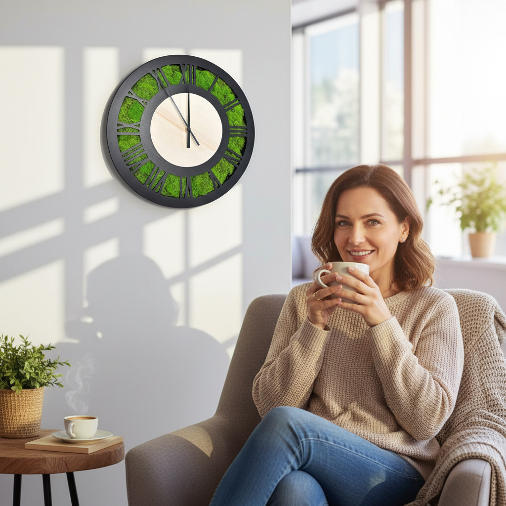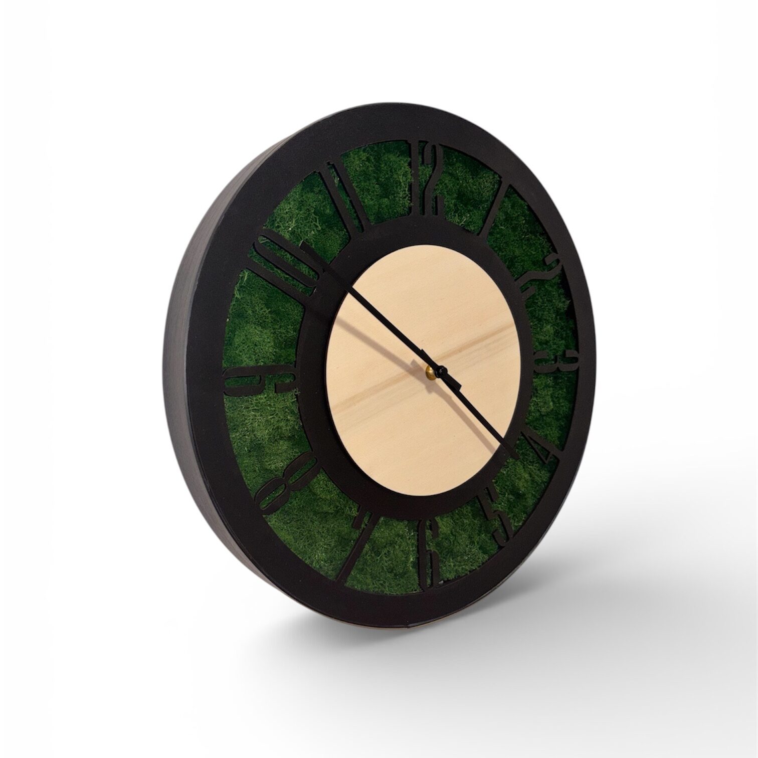 Obsahují hodinový ciferník s římskými číslicemi, což jim dodává elegantní a sofistikovaný vzhled. Tento klasický design skvěle kontrastuje s přírodním mechem, čímž vytváří harmonické spojení tradičního stylu s moderním přírodním prvkem.