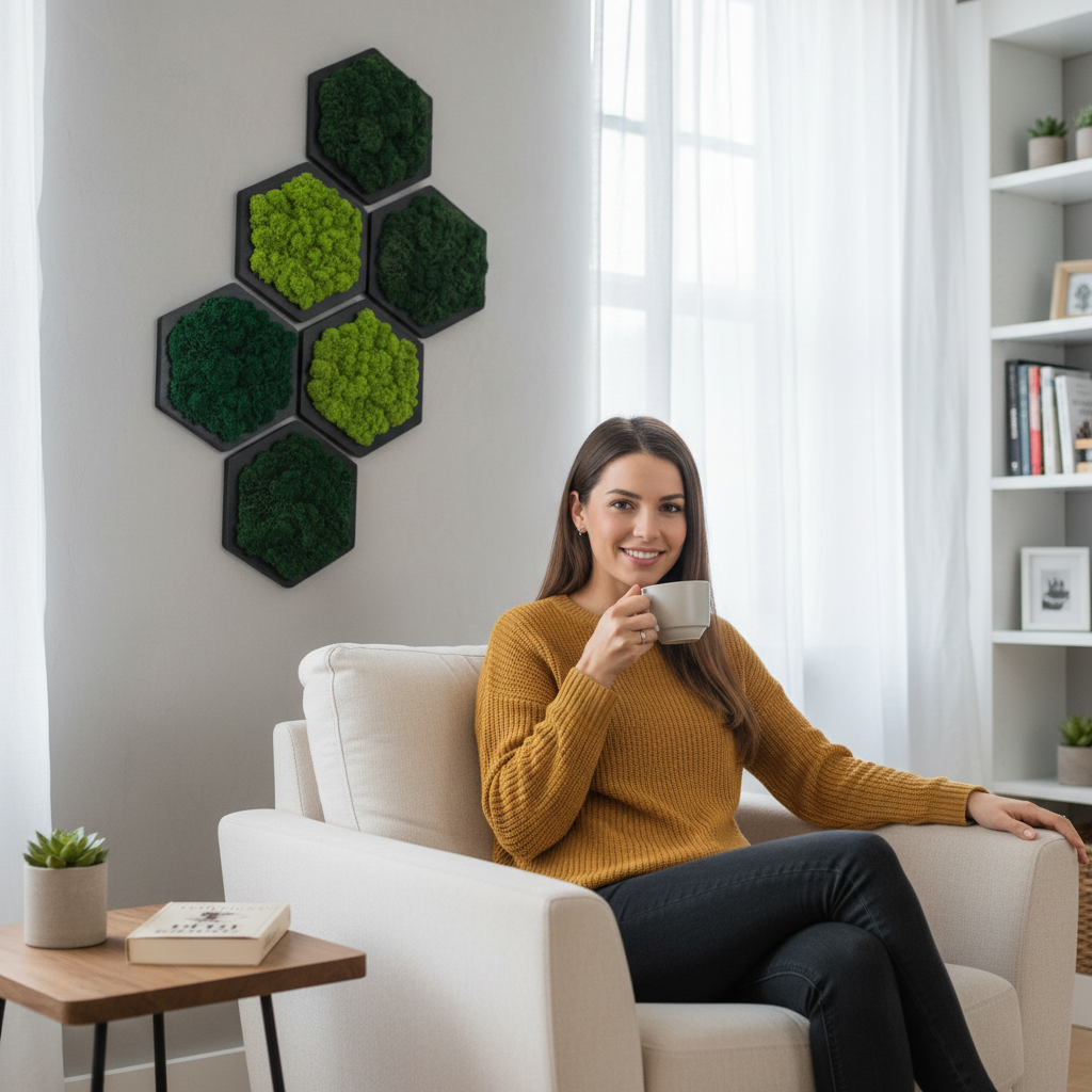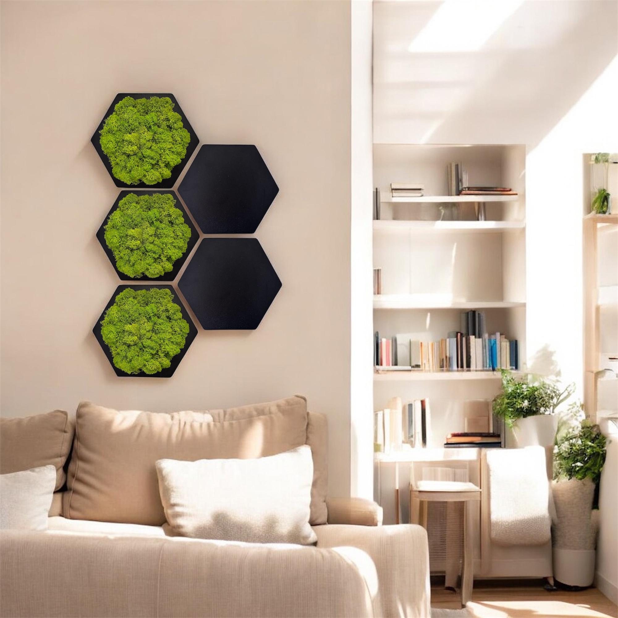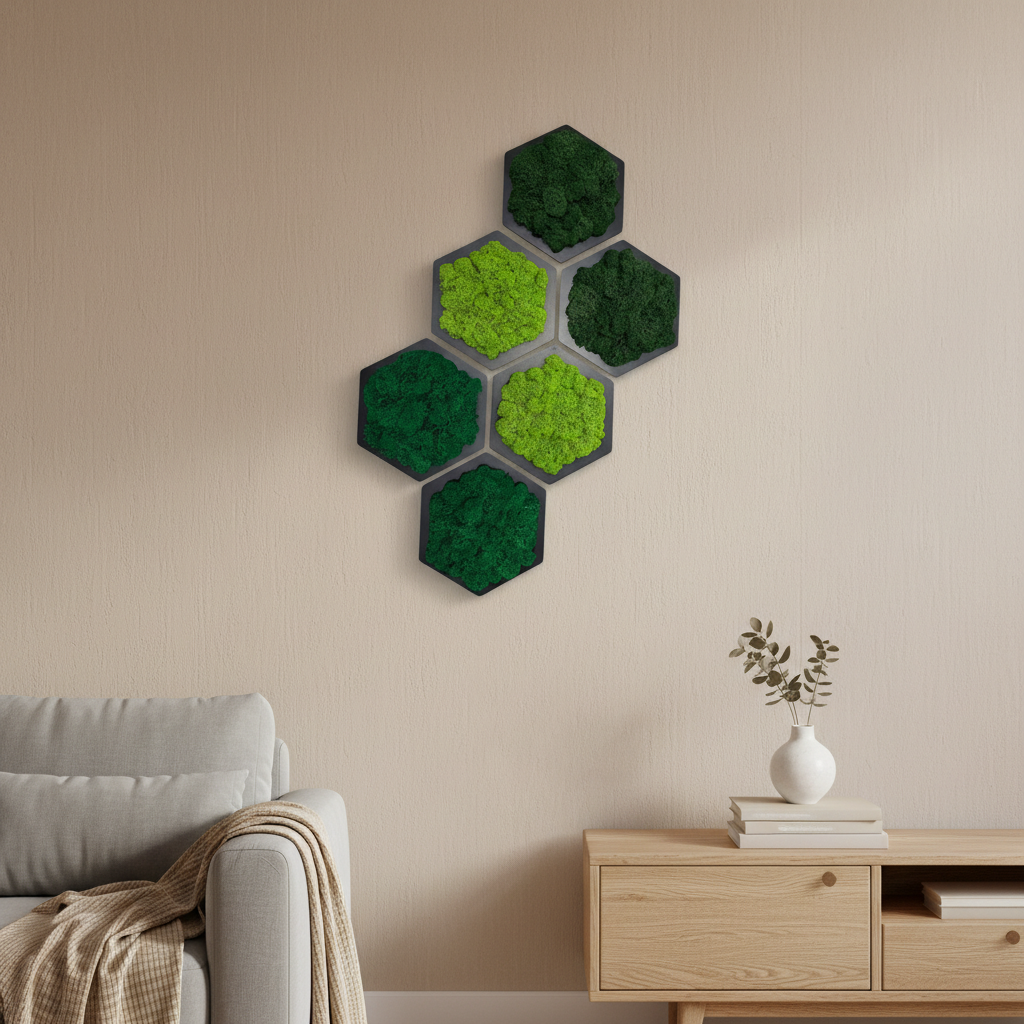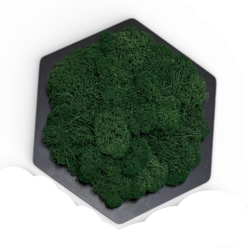 Mechový hexagon představuje originální a stylový prvek, který vnese kousek přírody přímo do vašeho interiéru. Stabilizovaný mech dodá svěžest každé místnosti a díky svým vlastnostem zůstává bezúdržbový a stále zelený po mnoho let.