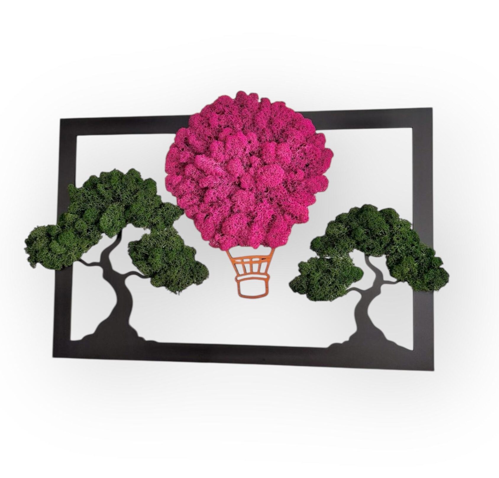 Balón snů je mechový obraz, který vás unese daleko od každodenního shonu – do světa ticha, zeleně a snění. Dominantou obrazu je balón z mechu ve fuchsiovém odstínu – výrazný, snový prvek, který jako kapka fantazie pluje nad zeleným klidem přírody. Je to spojení něhy a odvahy, jemnosti i živé energie.
