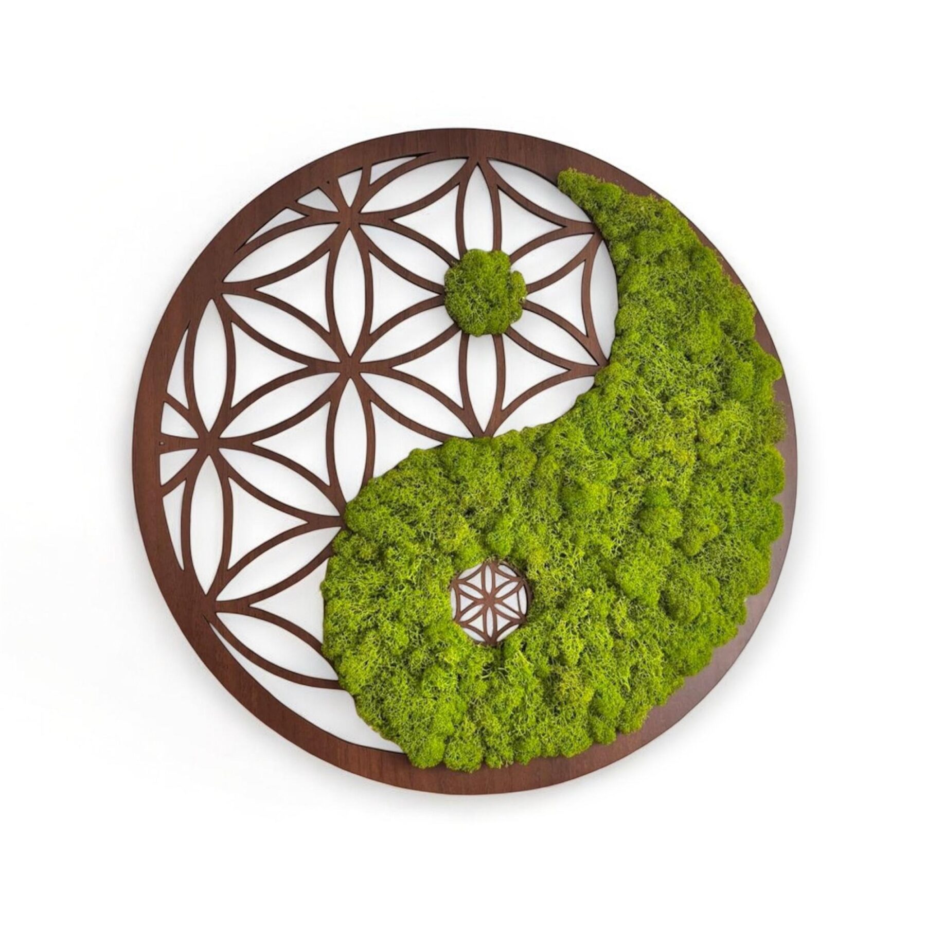 Mechový obraz Jin Jang s Květem života je originální nástěnná dekorace, která propojuje přírodní prvky s hlubokou symbolikou rovnováhy a energie. Obraz je vyroben ručně z kvalitních materiálů – jedna polovina symbolu Jin Jang je pokryta světle zeleným stabilizovaným mechem, který je bezúdržbový a zachovává si svěží vzhled po mnoho let, druhá polovina zůstává v elegantním ořechovém dekoru dřeva, čímž vzniká kontrast, jenž podtrhuje myšlenku rovnováhy protikladů. Symbol Květu života přináší do prostoru harmonizující energii a propojení se vším živým.