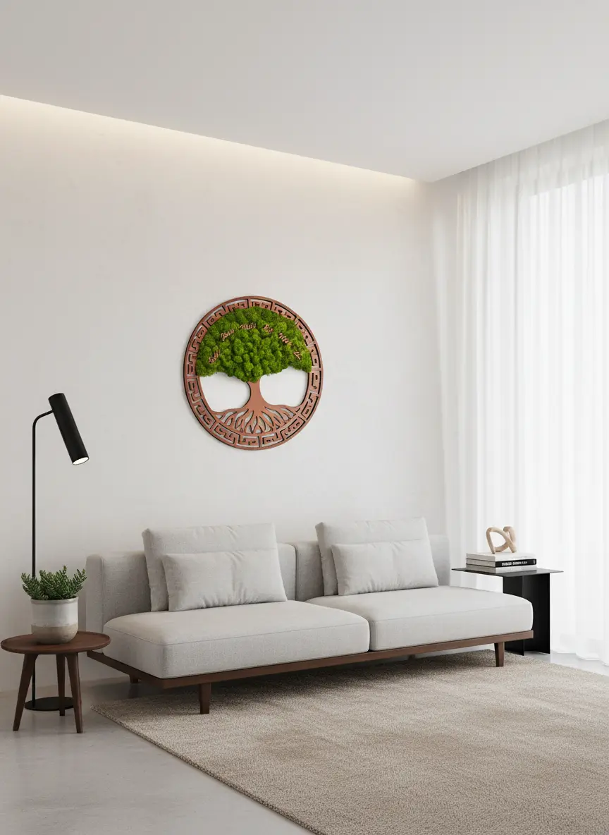 Obklopte se klidem, který dýchá přírodou. Mechový strom věčnosti je víc než jen dekorace – je to symbol propojení života, rovnováhy a času. Jeho kruhový tvar představuje nekonečný cyklus života, zatímco měkký, živý mech oživuje prostor svou sytou zelení a navozuje pocit harmonie a pohody. Rám tvoří symetrický geometrický ornament inspirovaný antickým vzorem, v jehož opakujících se liniích je zakódován symbol nekonečna. Tento motiv nejen dotváří harmonii celého obrazu, ale zároveň symbolizuje věčnost života, propojení všeho a nepřerušený tok energie v přírodě..